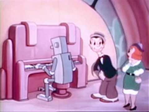 An old-fashioned man and woman take a stroll through a futuristic World\'s Fair.