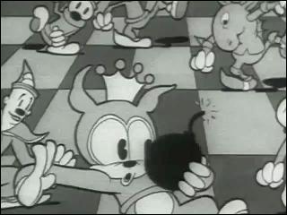 Betty Boop is the black queen and Bimbo the white king in a surrealistic chess game.