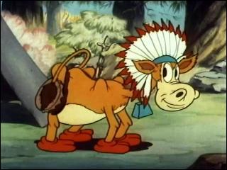 Molly Moo Cow walks across the frontier tied to a wagon with a couple of ducks. The ducks stop at the river and decide to take a swim. They see an indian's teepee at the other side, and decide to investigate. Molly goes around to see, and finds the ducks dancing in a circle with indian headdresses on. Elsewhere, an indian mom washes clothes on a river rock, and a baby hangs from a papoose in a tree. The baby drops into the river. Molly sees it, and jumps in to try and save the poor floating infant.