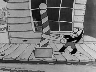 Flip is the village barber. A hairy dog comes in to get a shave, and Flip shaves his entire body! He dances to a spider playing a tune on the piano while he does it. His stove and flowers join in the dance, as does a duck, a cat, and the shaven dog.